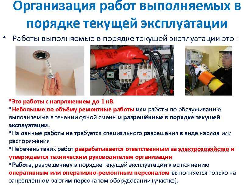 Raboti vklyuchyonnie v Perechen rabot vipolnyaemikh v poryadke tekushchey ekspluatatsii. Perechen rabot vipolnyaemikh v poryadke tekushchey ekspluatatsii v elektroustanovkakh do 1000 V. Raboti nam neobkhodimo proizvodit po naryadam-dopuskam rasporyazheniyam i po perechnyu rabot vipolnyaemikh v poryadke tekushchey ekspluatatsii.