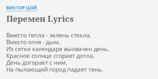 Tsoy peremen trebuyut nashi serdtsa tekst. Peremen trebuyut nashi serdtsa Peremen trebuyut nashi glaza V nashem smekhe i v nashikh slezakh I v pulsatsii ven Peremen. Pesnya Viktora Tsoya Kino - Peremen trebuyut nashi serdtsa dlya mnogikh olitsetvoryala predchuvstvie podlinnikh peremen a ne prosto krasivuyu khudozhestvennuyu metaforu. Trebuyut nashi glaza.