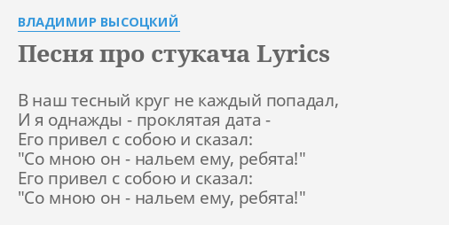 V nash tesniy krug ne kazhdiy popadal I ya odnazhdi - proklyataya data - Ego privel s soboyu i skazal. Na sud popal sluchayno ya 03. Chitayte stikhotvorenie Vladimira Semyonovicha Visotskogo V nash tesniy krug ne kazhdiy popadal a takzhe drugie proizvedeniya poeta.