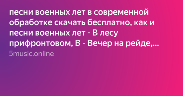 V nashem sbornike sobrani voennie pesni k 9 maya dlya detey kotorie mozhno slushat onlayn ili skachat besplatno v formate mp3. Pesni voennikh let dlya skachivaniya Slushat muziku i pesni v visokom kachestve. Ona rodilas sovershenno sluchayno.